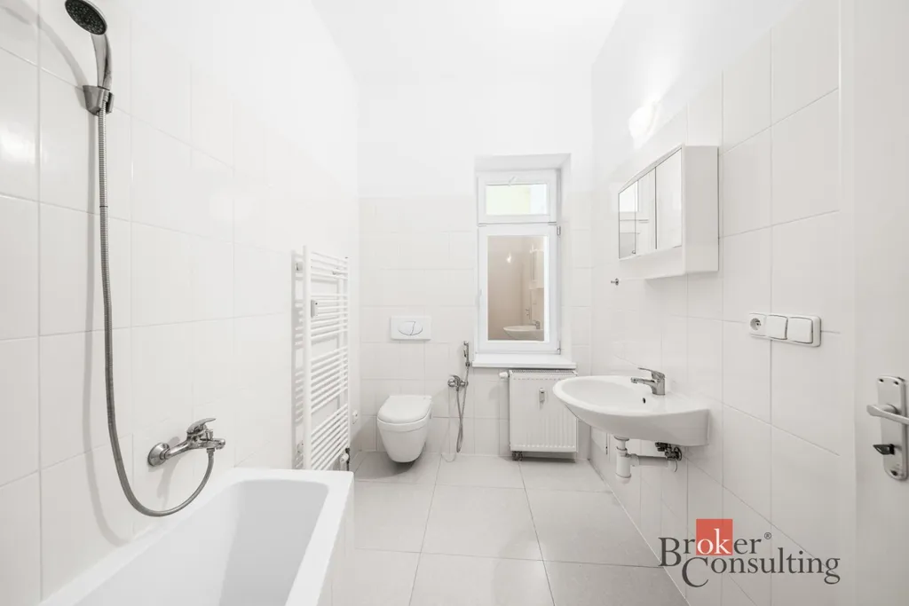 Velmi praktickým prvkem je prostorná chodba o výměře 23 m², kde je vyhrazeno samostatné místo pro šatnu o velikosti 5,5 m², což výrazně zvyšuje komfort a úložné možnosti bytu. K dispozici je koupelna se sprchovým koutem a toaletou o velikosti 6 m² a zároveň oddělené samostatné WC o ploše 2 m².