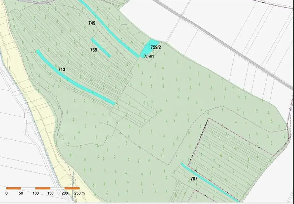 Jedná se o prodej lesních pozemků menší výměry, většinou úzkého protáhlého tvaru, rozptýlených po komplexu lesů v k.ú. Dolní Vilémovice. Na pozemcích se nachází mýtní porost BO, porost na pozemku parc. č. 787 byl vytěžen.