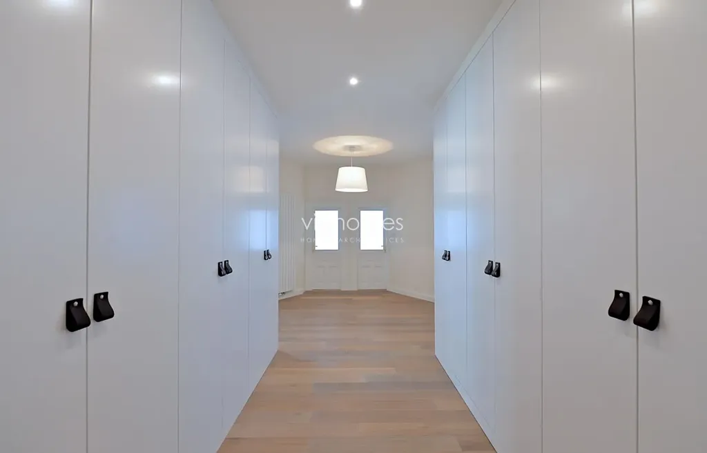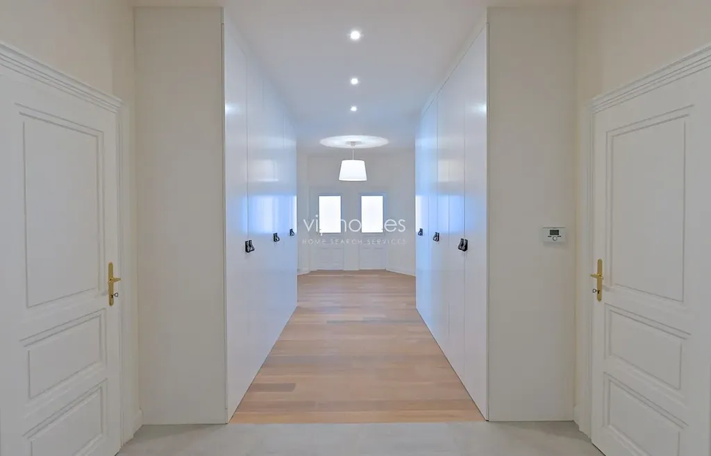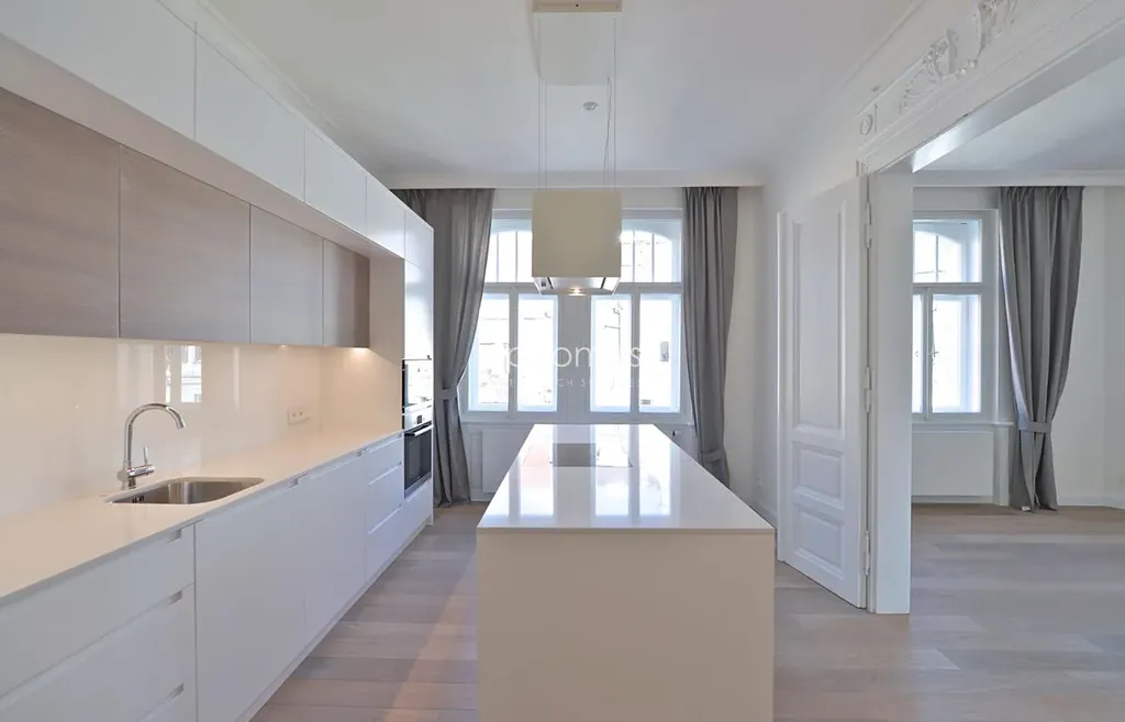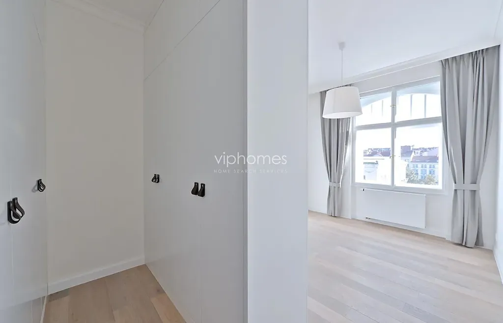 Interiér bytu o velikosti 137 m2 tvoří moderně propojený obývací pokoj s kuchyní, 2 prostorově velkorysé ložnice, 2 minimalisticky pojaté koupelny s toaletou a technické zázemí Dřevěné dubové, pračka/sušička, vestavěné skříně, nová okna s dvouvrstvým sklem, internet. Byt je kompletně zařízený.