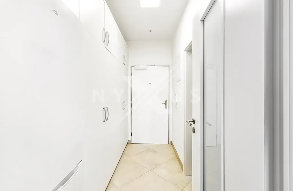 Byt se prodává včetně vybavení, takže je připravený k okamžitému nastěhování nebo k rychlému pronájmu bez dalších nákladů. Interiér je řešený chytře a prakticky – hned ve vstupní části najdete vestavěné úložné prostory na míru a elegantně integrovanou kombinovanou lednici. Moderní koupelna nabízí sprchový kout, WC, umyvadlo se zrcadlem, topný žebřík i pračku. Hlavní obytný prostor je vzdušný a díky promyšlenému členění přirozeně kombinuje kuchyňskou, jídelní, relaxační i spací zónu. Kuchyňská linka je plně osazená spotřebiči (indukce s digestoří, trouba, vestavná myčka, mikrovlnná trouba) a doplněná o dostatek úložných skříněk. Součástí vybavení je také dvoulůžko 200 × 200 cm, šatní skříň, jídelní stůl se dvěma židlemi, rohová sedací souprava a TV sestava.