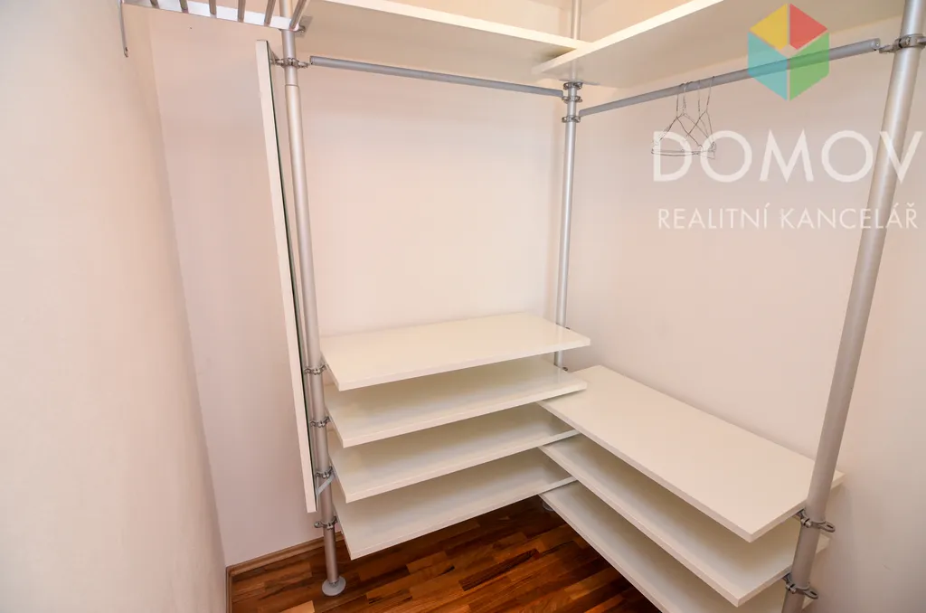 V bytě jsou plovoucí podlahy a dlažba, dřevěná okna, obložkové dveře a vestavěné skříně.