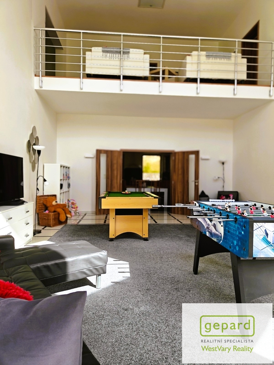 Dispozice domu: v přízemí vstup do vzdušné haly s kuchyní, obývacím prostorem v něj jsou automatické krbové kamna na pelety s dálkovým ovládáním přes aplikaci, kancelář a herna se vstupem na zahradu. Samostatný pokoj oddělený od společenské části domu, vhodný jako pracovna, ložnice pro návštěvy. Koupelna s toaletou a sprchovým koutem, technická místnost. V patře je šatna a 3 ložnice, všechny mají samostatnou koupelnu se sprchovým koutem nebo vanou a saunou. Z galerie 1. patra je výhled do obývací části domu a balkon nad kanceláří s výhledem do lesa. Dostatek parkovacího místa na vlastním pozemku.