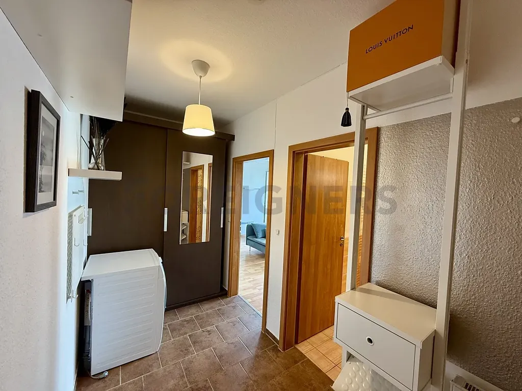 Byt je plně zařízený nábytkem, televizí, kuchyňská linka včetně spotřebičů (myčka, trouba, vestavěné skříně, stůl a židle, pračka.