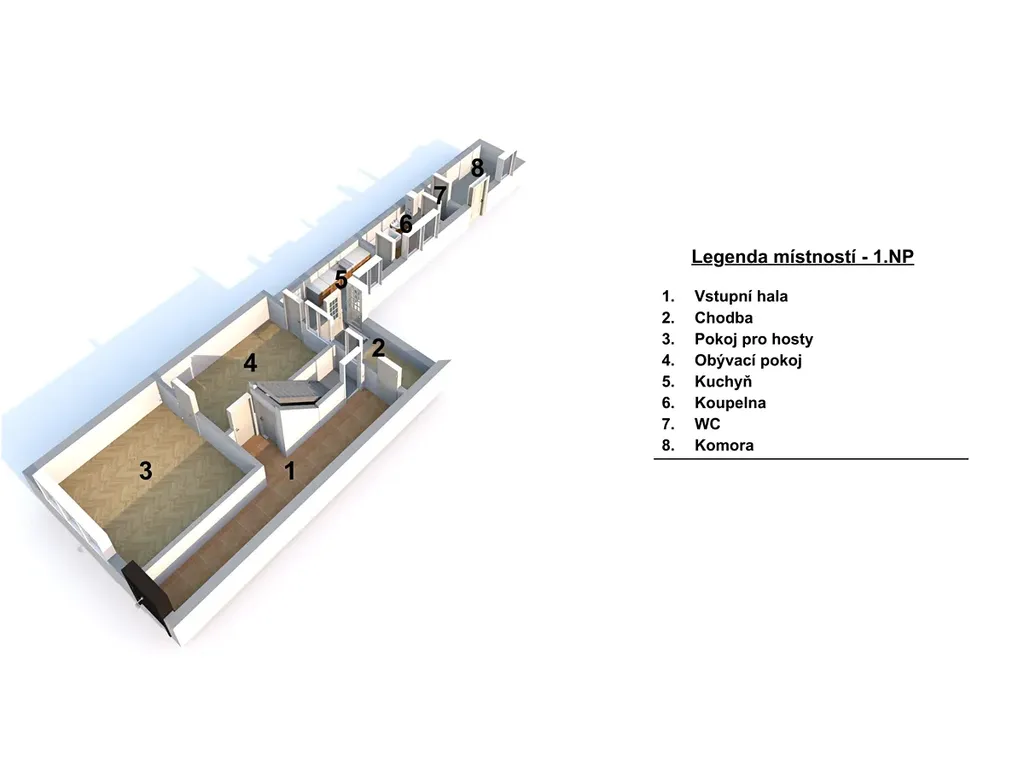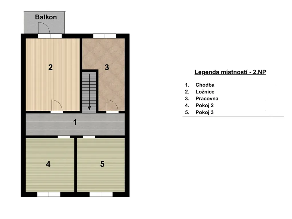 2. nadzemní podlaží nabízí celkem čtyři samostatné místnosti: