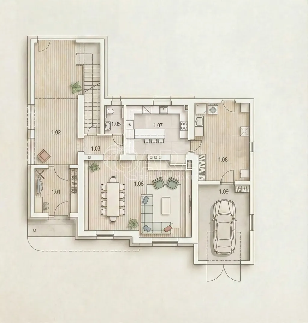 Dle studie je vila navržena jako dispozice 6+kk s garáží a ve druhé fázi také s vnitřním bazénem, na pozemku o velikosti 847 m2. Projekt počítá s komfortním rodinným bydlením, dostatkem prostoru, soukromím i logickým provozním uspořádáním domu.