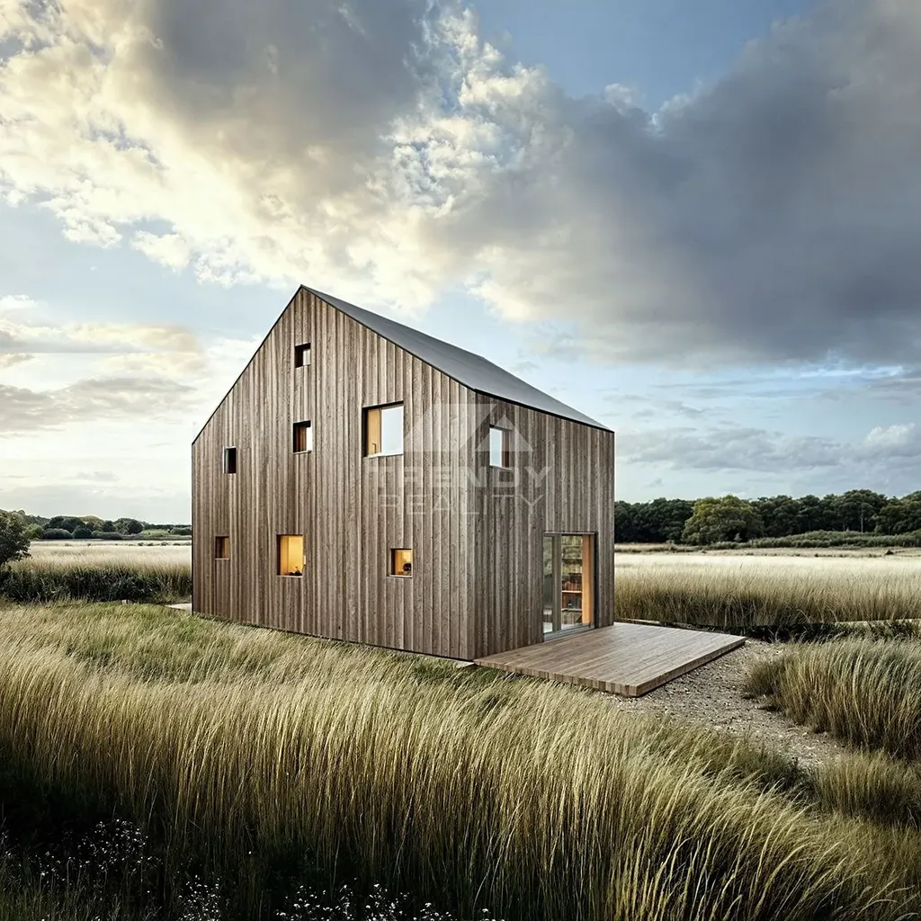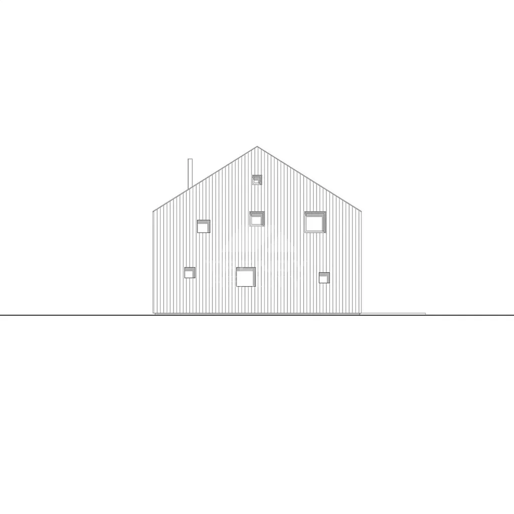 Kompaktní dům pro celý život: přízemí s obytným prostorem a kuchyní (36 m²). Patro s mezipatrem umožňuje variabilitu – začíná jako 2+KK pro mladý pár, lze upravit na 3+KK pro rodinu s dětmi nebo 4+KK s dvěma ložnicemi po 11 m². Po odchodu dětí se vrací k původní otevřené dispozici. Moderní dřevěný design s krytou terasou. Nízkoenergetická konstrukce domu s podlahovým topením zajišťuje nízké provozní náklady na vytápění a maximální komfort.