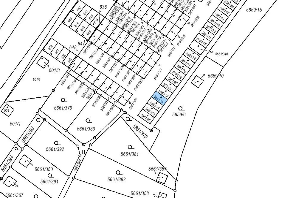 Garáž č.e. 738 stojí na pozemku parc. č. 5661/83 (parcela ve vlastnictví jiného vlastníka – Statutárního města Jihlava, list vlastnictví 10001)