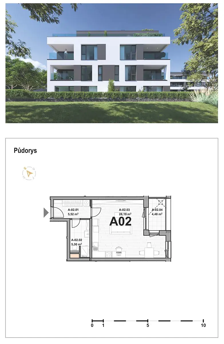 Jednotka A02 sestává z obývacího pokoje s kuchyňským koutem, koupelny s WC a předsíně. Součástí je i sklepní box v suterénu budovy. K bytu je možné dokoupit parkovací stání v suterénu domu.