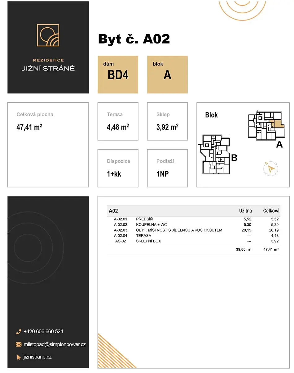 Do této kategorie patří i prezentovaný byt s označením BD4_A02 o dispozici 1+kk s celkovou plochou 47,41 m² (byt 39 m², terasa 4,48 m² a sklep 3,92 m²).