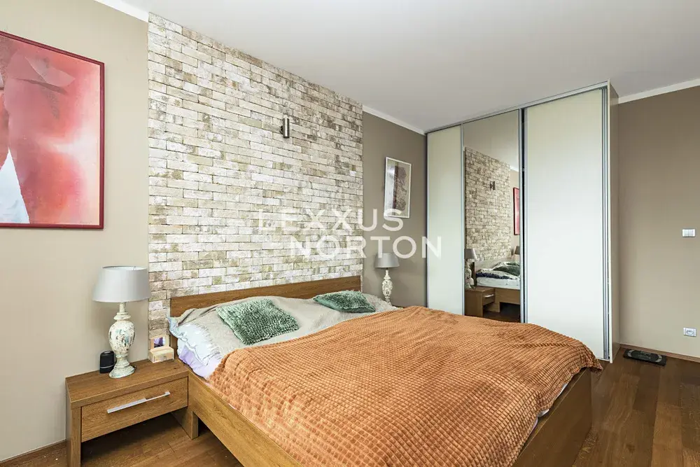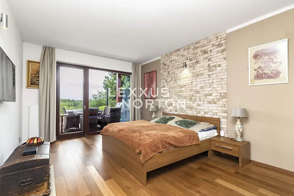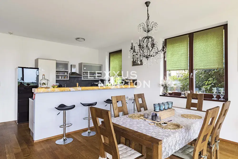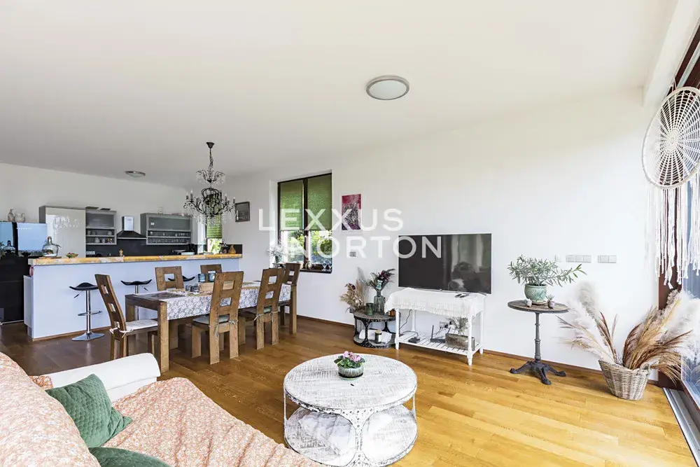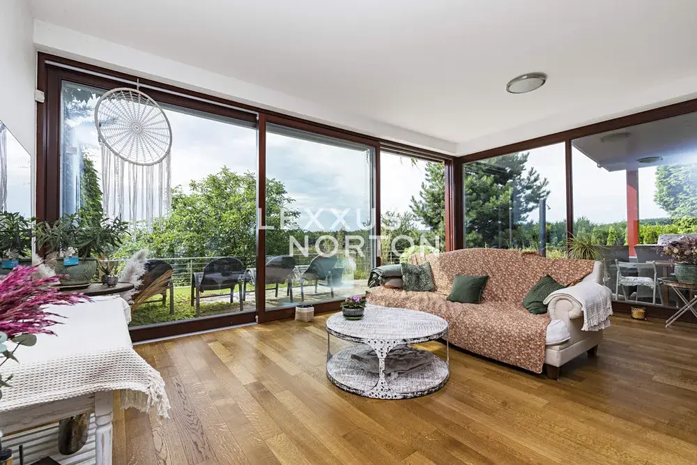 Obytná plocha 190 m2 poskytuje pohodlné bydlení. Interiér se skládá z prostorné vstupní haly, obývacího pokoje s velkými okny, barovým posezením a navazujícím kuchyňským a jídelním koutem. Z obývacího pokoje je vstup na terasu a zahradu. Dále jsou zde dvě ložnice, z nichž jedna má přímý vstup na terasu, dvě koupelny a komoru.