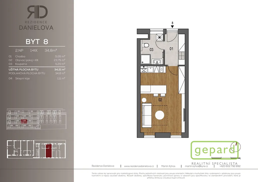 Nabízíme k pronájmu atraktivní byt v novostavbě o dispozici 1+kk se sklepem v přízemí domu, nacházející se na adrese Danielova, v klidné části obce Čakovice, Praha 9.