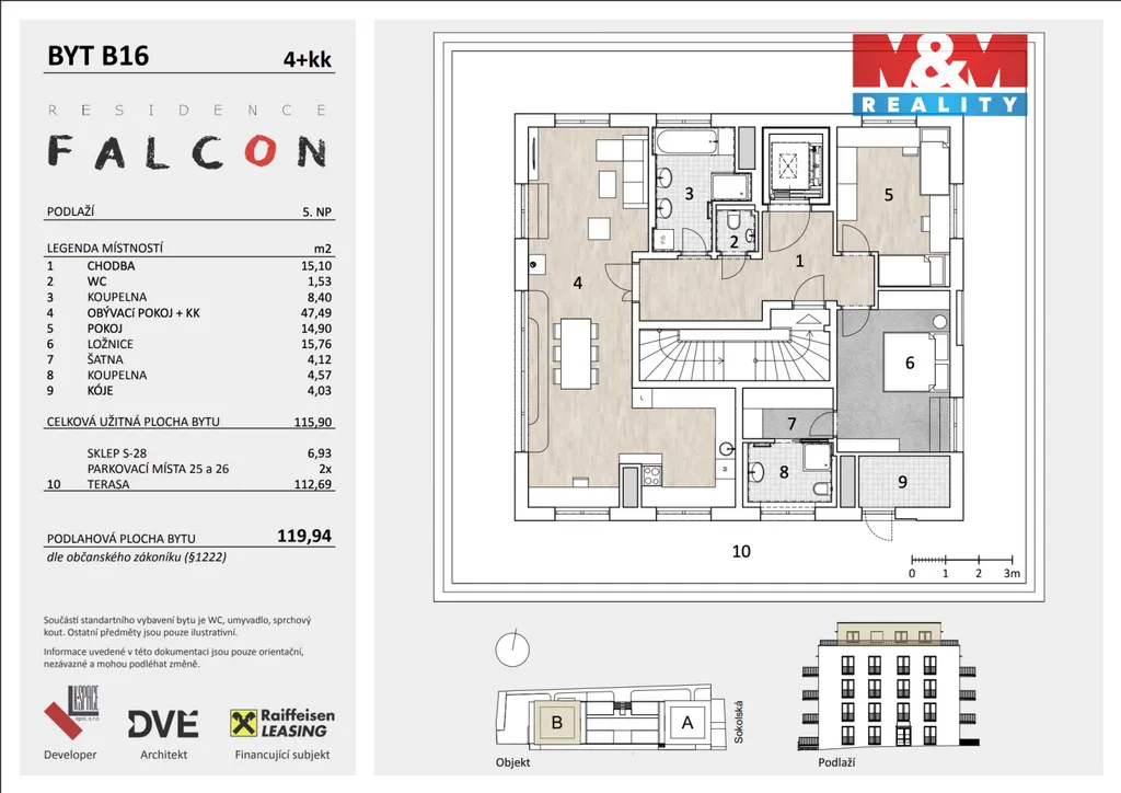 Druhou variantou je exkluzivní penthouse o výměře 120 m², který zabírá celé páté patro domu. Přístup výtahem přímo do chodby bytu, terasa o velikosti 112,69 m² orientovaná na všechny světové strany, hliníkové HS portály a příprava na krb podtrhují jeho výjimečný charakter. Obě jednotky disponují podlahovým vytápěním a možností volby standardů Friendly a Gorgeous. Pro osobní prezentaci a porovnání obou variant nás kontaktujte.