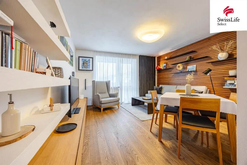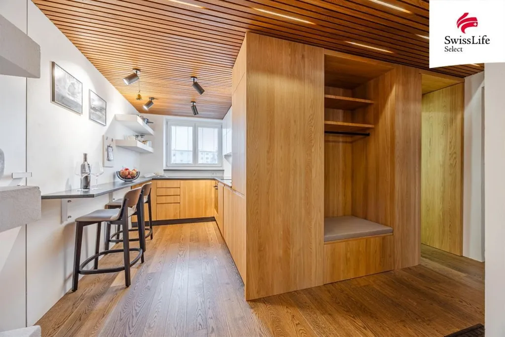 Dřevěné podlahy a podhledy s nepřímým LED osvětlením vytvářejí příjemné a útulné prostředí. Důraz byl kladen na detaily, které mají v každodenním provozu smysl zaoblené rohy stěny v ložnici podporují klidný charakter místnosti, vestavěné skříně nabízejí velkorysý úložný prostor a klimatizace zajišťuje komfort i v letních měsících, aniž by narušovala celkový vzhled interiéru. Součástí vybavení jsou také zabudované kuchyňské spotřebiče a bezpečnostní vchodové dveře s izolací.
