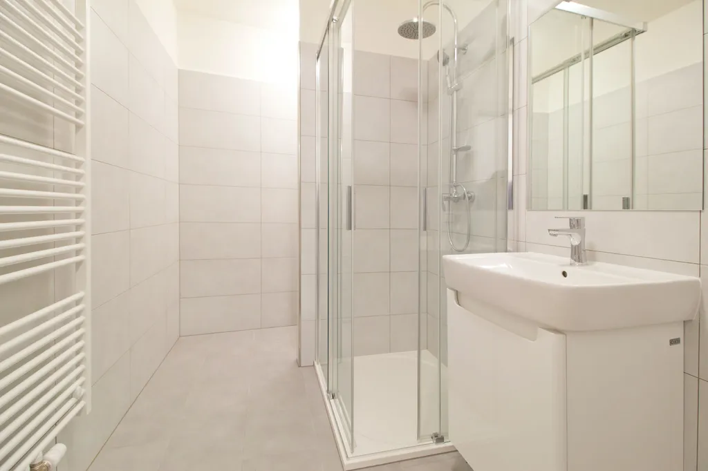 Koupelna v moderním designu je vybavena sprchovým koutem, závěsným WC, topným žebříkem a umyvadlem se skříňkou. V koupelně je prostor pro připojení pračky.