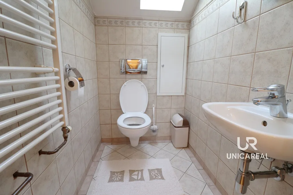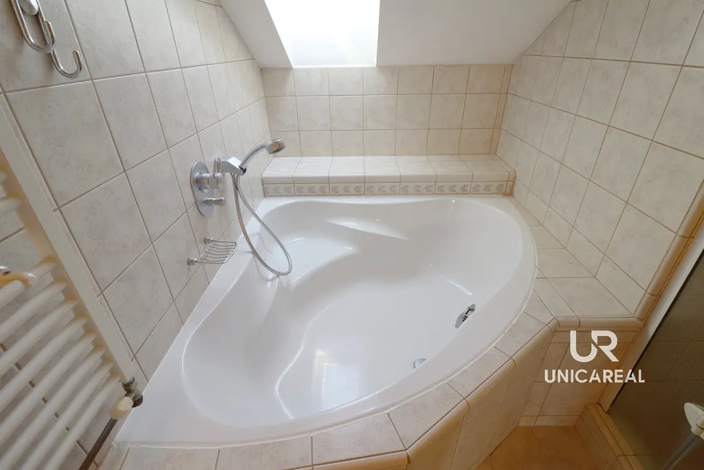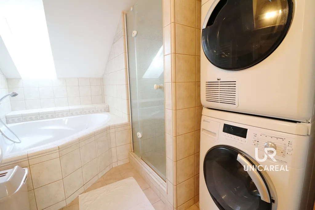 - koupelna se sprchovacím koutem, rohovou vanou, umyvadlem, vybavena automatickou pračkou, samostatnou sušičkou prádla,