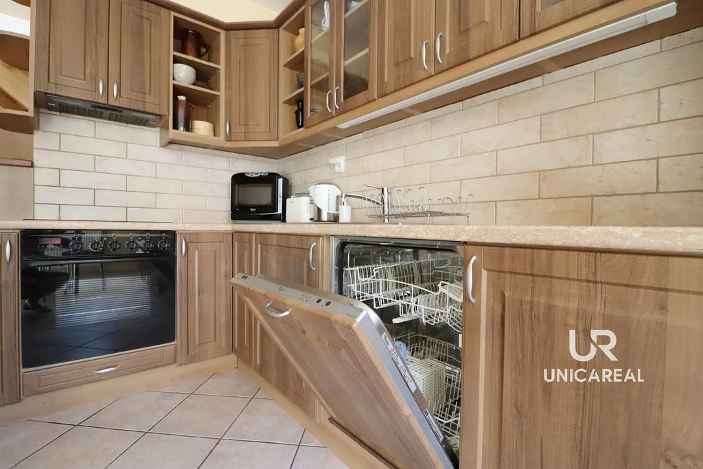 - prostorná kuchyně s veškerými funkčními spotřebiči (indukční varná deska, el. trouba, digestoř, mikrovlnka, myčka, lednička s mrazničkou, nechybí zde ani nádobí , talíře, sklenice, příbory... ) , jídelní stůl se židlemi, samostatná toaleta s umyvadlem a oknem,