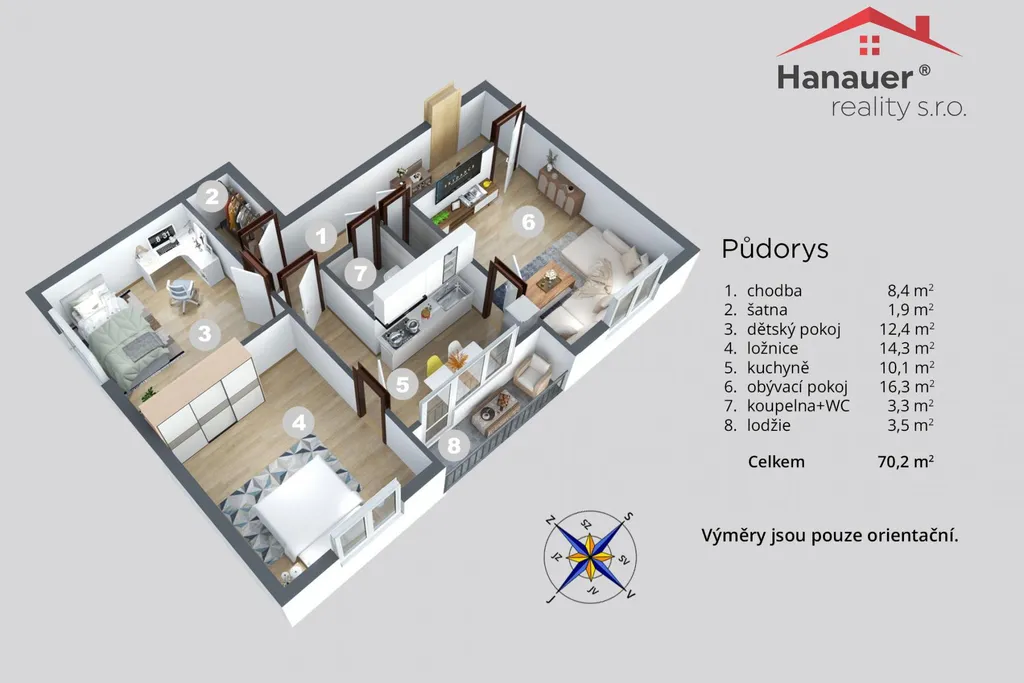 Dispozice, která funguje léta a fungovat bude dál: prostorná vstupní chodba, umakartové jádro s koupelnou a samostatným WC, tři neprůchozí pokoje a samostatná kuchyně. Ideální základ pro moderní rekonstrukci, žádné kompromisy, žádné slzy při bourání.