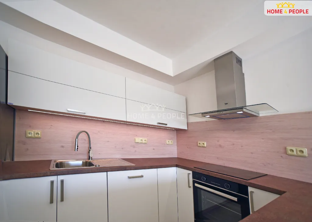 - obývací prostor vkusně oddělen od odpočinkové zóny kuchyňskou linkou do tvaru U (lednice,