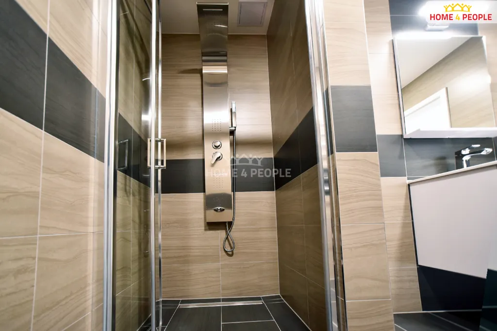 - v koupelně je přípojka na pračku, tepelný žebříček. Sprchový kout je vybaven designovou