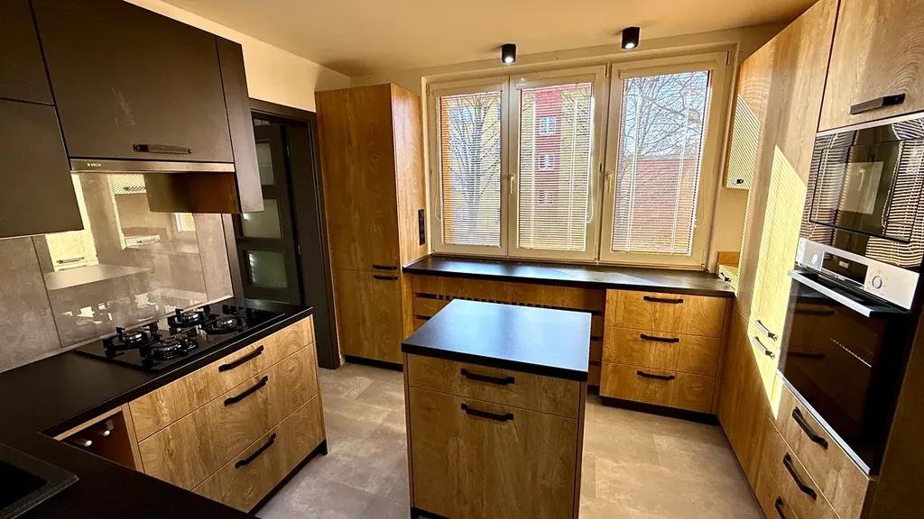 Dominantou bytu je prostorná kuchyně s kuchyňským ostrůvkem, plynule propojená s obývacím pokojem. Ložnice a další pokoj (dětský pokoj / pracovna) jsou samostatné a poskytují dostatek soukromí. Koupelna je prostorná, vybavená sprchovým koutem a umyvadlem, toaleta je oddělená.