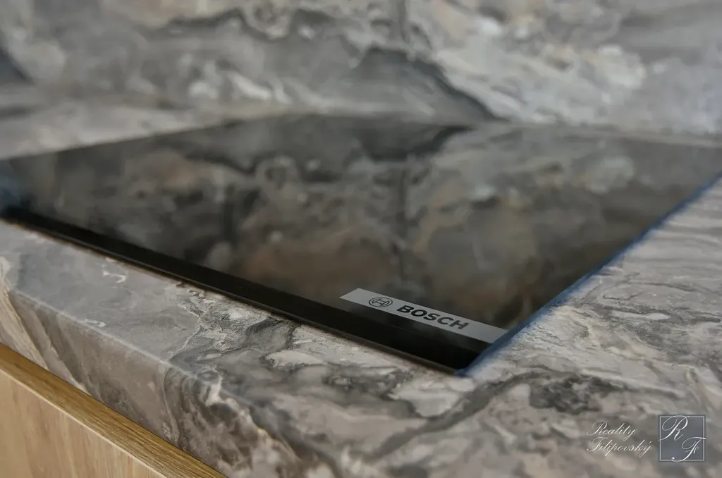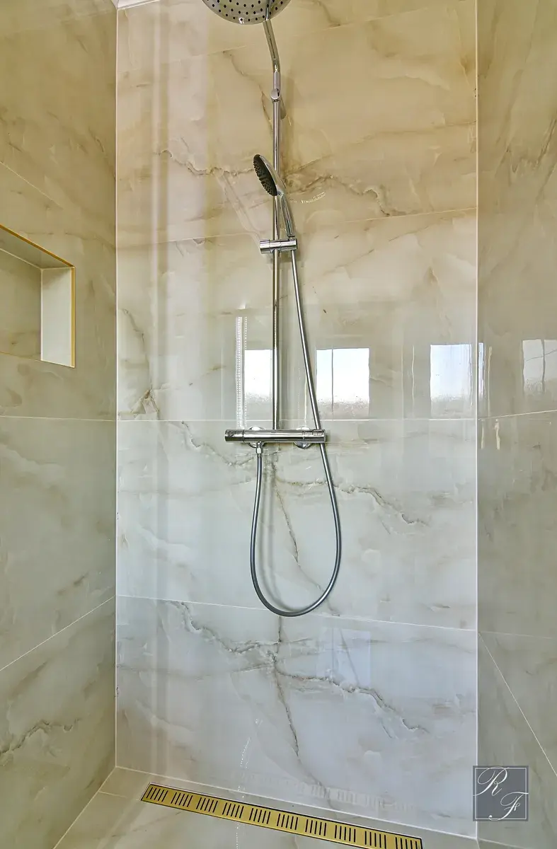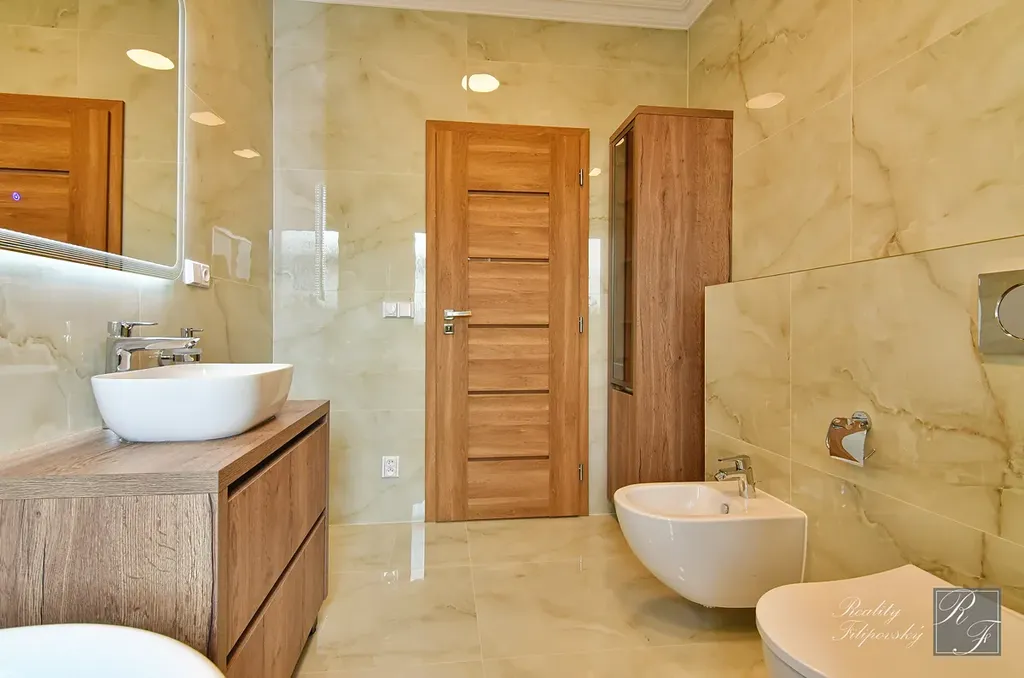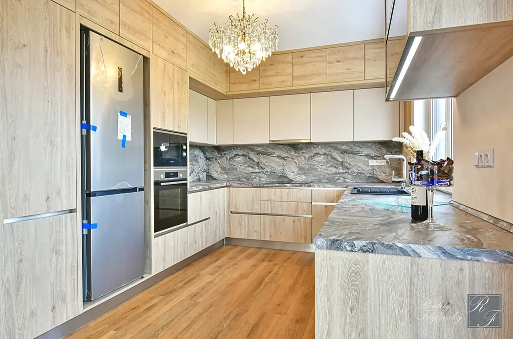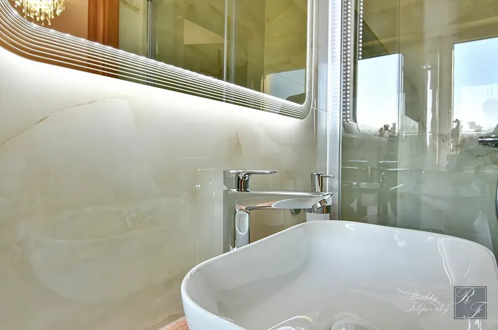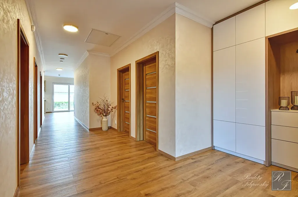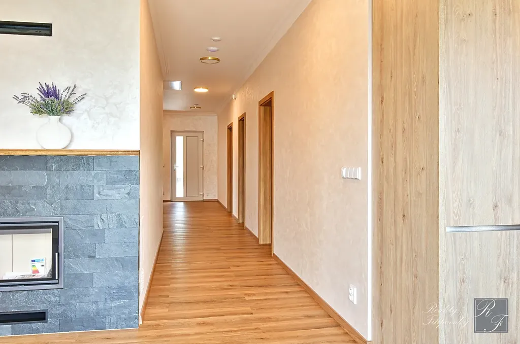 Robustní vestavné skříně jsou zhotoveny ze zdvojeného materiálu s kompletním vnitřním vybavením a automatickými dojezdy v každé z ložnic. Kuchyňská linka na míru se spotřebiči Bosch včetně spíže, která obsahuje kompletní vnitřní vybavení. Osvětlení je ve všech místnostech a je řešeno vestavným či stropním osvětlením, centrálními křišťálovými lustry a zrcadly s integrovanými led světly. V koupelnách jsou pákové a termostatické baterie zn. Grohe a Hansgrohe. Dvougaráž je osazena automatickými zateplenými sekčními garážovými vraty Trido s dálkovým i přímým ovládáním. Automatická brána na dálkové ovládání, vstupní branka s integrovanou poštovní schránkou i čelní plotové výplně jsou zn. Luxline. Obložení domu i krbu je z přírodního kamene.