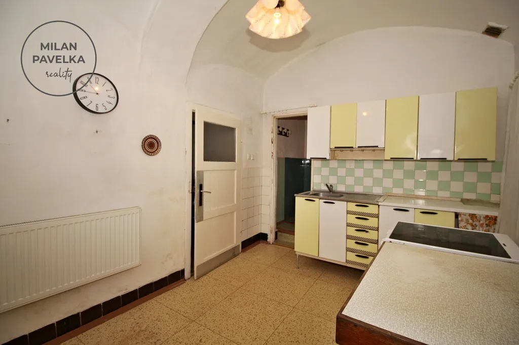Vstup do domu - 1. NP: chodba, 3 pokoje, kuchyně, spíž, sociální zařízení. Za průjezdem z ulice na dvůr je ještě jeden pokoj, původní kotelna a prádelna s plynovým kotlem.