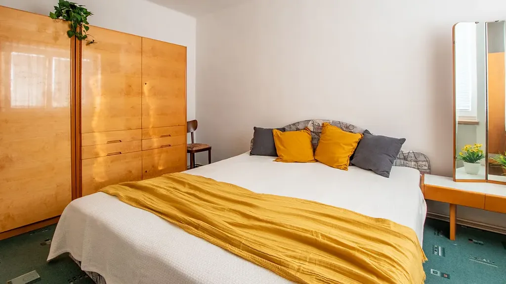 Dispozice bytu je řešena vstupní chodbou, ze které je vstup do koupelny s vanou a samostatného WC, kuchyně se vstupem do dětského pokoje a obývacího pokoje, ze kterého se dostanete do ložnice a na balkón. Máme tu tedy dva neprůchozí pokoje, využité jako ložnice a dětský pokoj. Na chodbě a v kuchyni jsou vestavěné skříně, nabízející dostatek úložného prostoru.