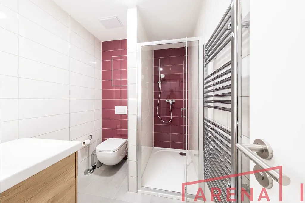 Koupelna nabízí prostorný sprchový kout, umyvadlo, závěsné WC a elektricky vyhřívaný žebřík. V celém bytě je podlahové vytápění, ohřev vody je centrální. Okna orientovaná na východ jsou osazena elektricky ovládanými screenovými roletami, které zajišťují komfort i soukromí.