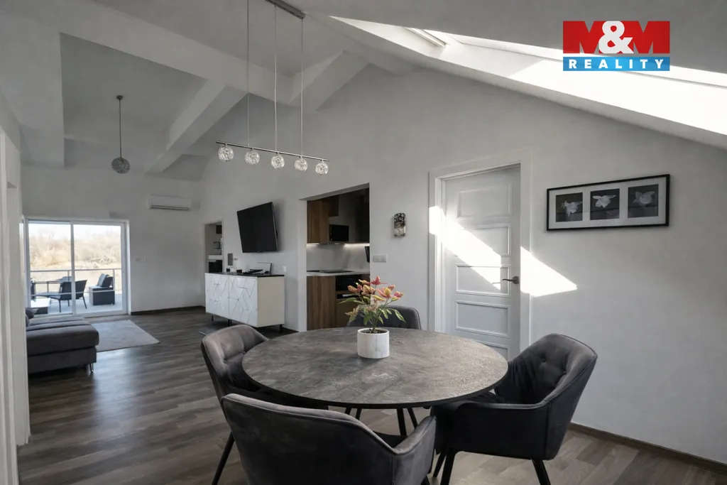 Dominantou bytu je velkorysý světlý obývací prostor s vysokými stropy, přiznanými trámy navazující na terasu s otevřeným výhledem do zeleně.