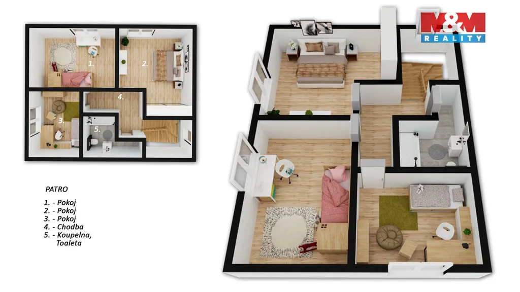 Patro: Dvě komfortní ložnice, jeden menší pokoj ideální jako dětský pokoj nebo pracovna. Koupelna s vanou a toaletou. Interiér je kompletně dokončen, na podlahách je položen vinyl, koupelny jsou plně zařízené. Stačí už jen vybavit nábytkem a můžete bydlet!