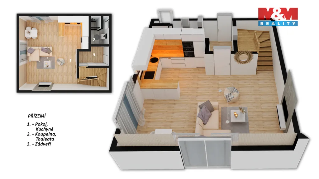 Přízemí: Prostorný obývací pokoj s kuchyňským koutem a přímým vstupem na terasu. Koupelna se sprchovým koutem. Technická místnost. Vstupní hala.