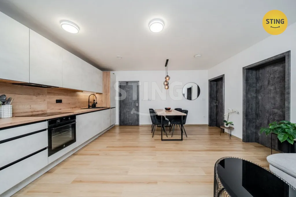 • Srdce bytu: Velkorysý obývací prostor s jídelní zónou a moderní kuchyní (plně vybavená linka: indukce, myčka, trouba, lednice).