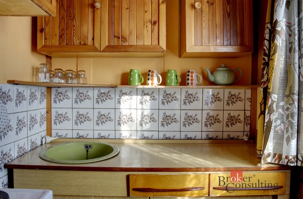 Chata má užitnou plochu cca 38 m² a praktickou dispozici 2 pokoje + kuchyňka. Stavba je postavená na zděných základech, je částečně podsklepená a má sedlovou střechu, což zajišťuje stabilitu i dobré využití prostoru.