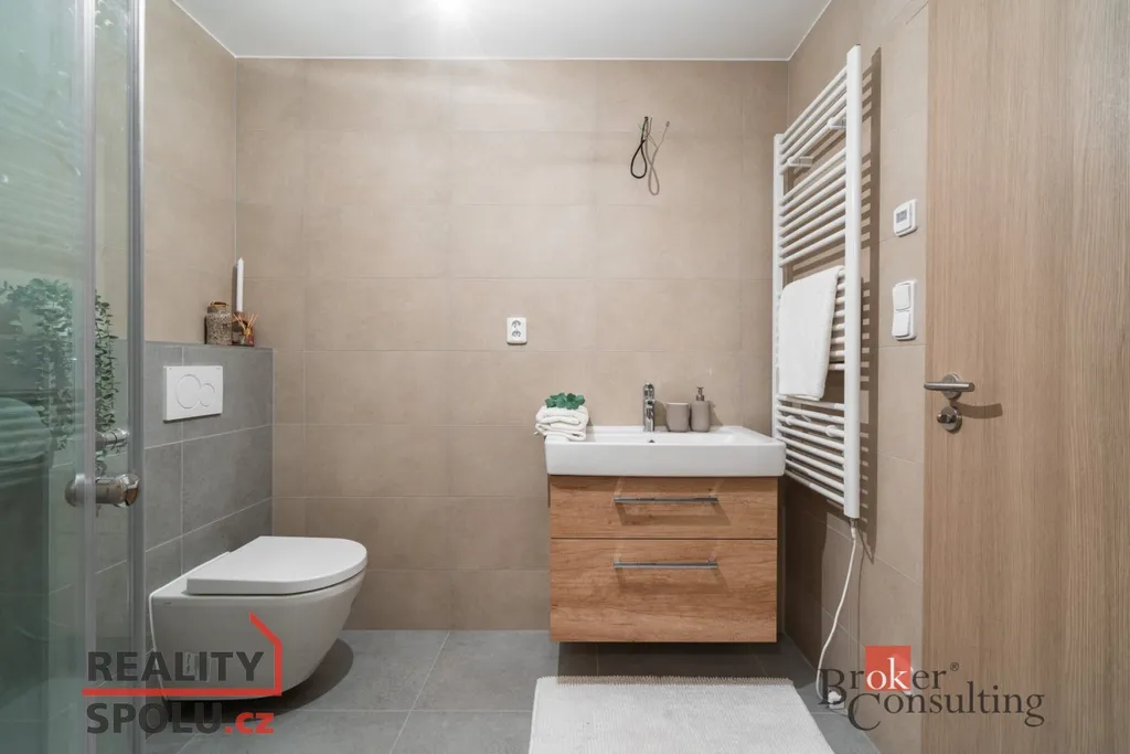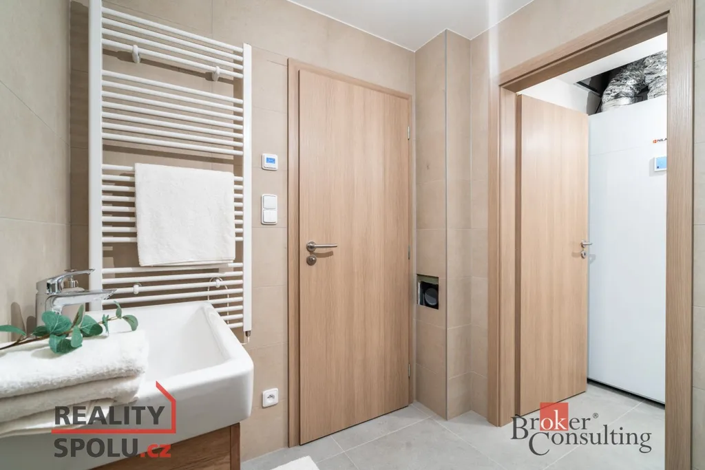U domu se nachází také prostorná garáž se skladem zahradního nářadí (28,5 m²), kde je uložena technologie FVE a příprava pro bateriové úložiště.