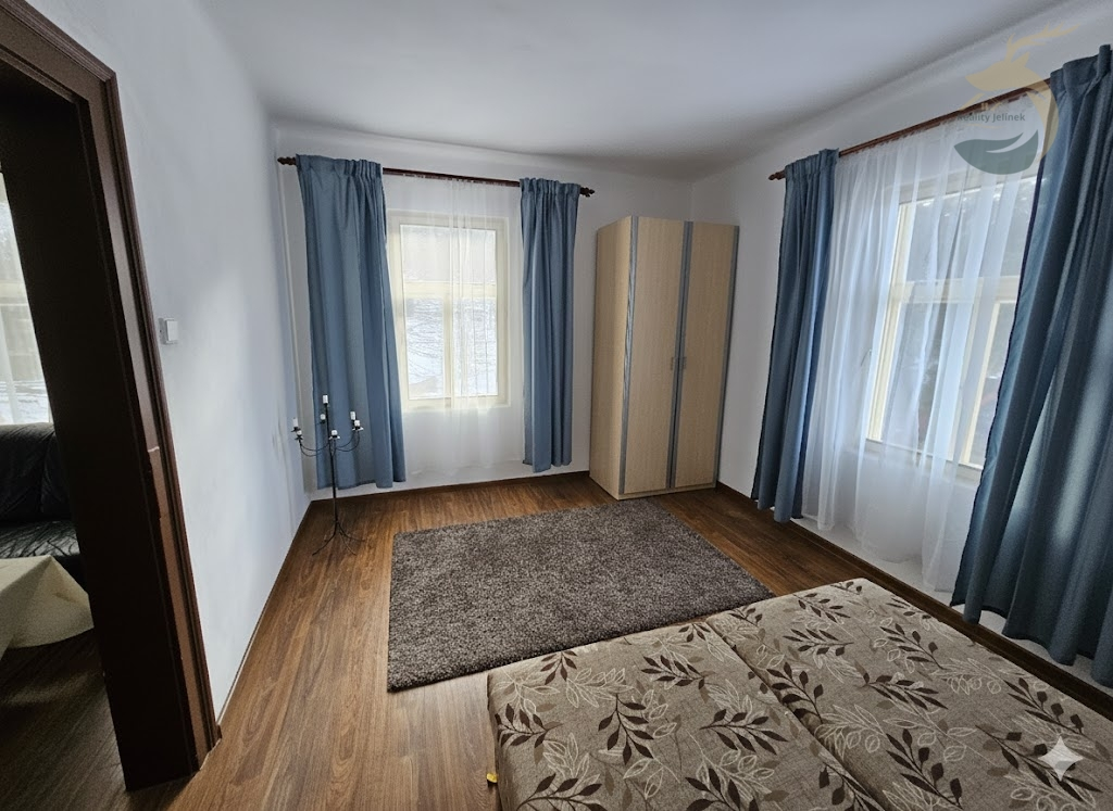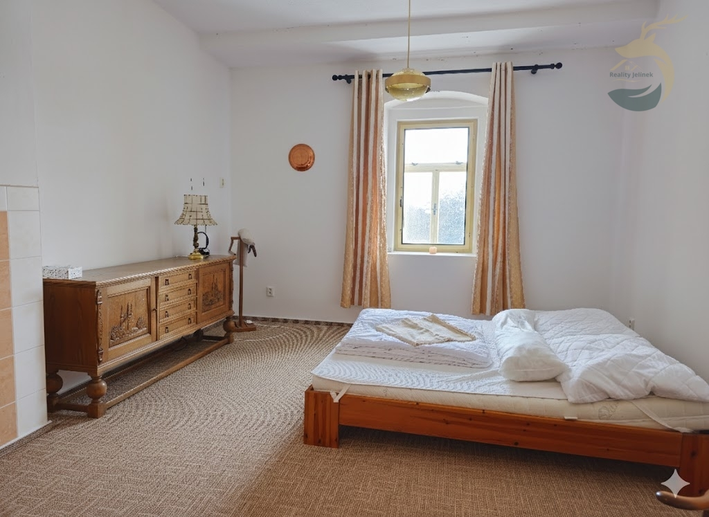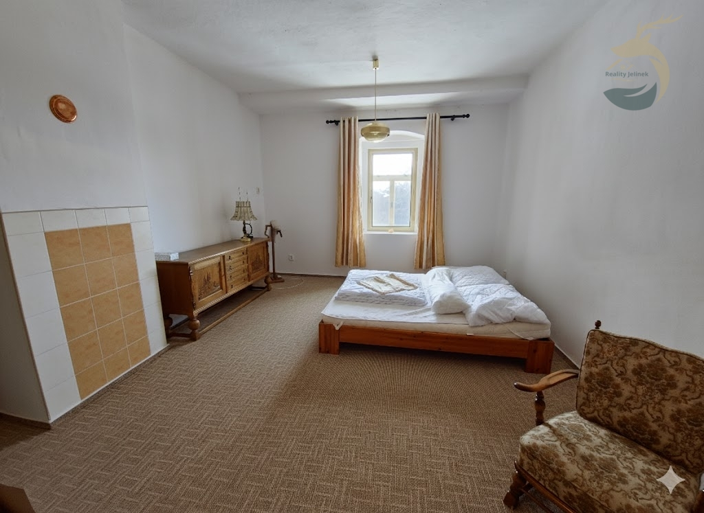 V patře jsou dva pokoje tvořené vždy dvěma vzájemně propojenými místnostmi a dále jeden centrální prostorný pokoj s balkonem a výhledem do okolní krajiny. Součástí patra je také druhá koupelna, která byla realizována v roce 2025, včetně instalace podlahového vytápění. Dispozičně patro nabízí celkem pět místností.