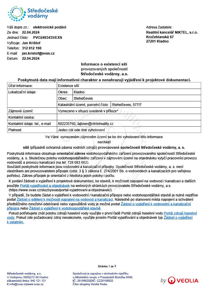 Pozemek není v současné době oplocen. Příjezdová komunikace je asfaltovaná, vybudované chodníky ze zámkové dlažby, včetně veřejného osvětlení. Obec je velmi žádanou lokalitou a nabízí především klid a výhody venkovského bydlení. Veškerá občanská vybavenost (školka, škola, nákupní centrum Stehelčeves- BILLA, DM drogerie, ZOO centrum, Mc Donald’s, restaurace, čerpací stanice, automyčka, pošta Partner, obecní úřad, dětské hřiště, kulturní i sportovní vyžití). Výborné dopravní spojení: nájezd na dálnici D7 (Chomutov – Praha) 1 min. autem, Praha 20 min.. Autobusové spojení z obce Stehelčeves je do obcí: Kladno, Praha, Slaný.