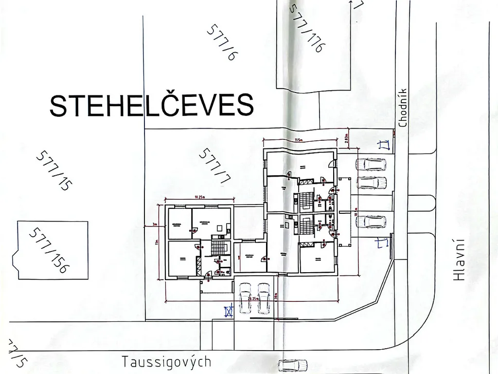 Mírně svažitý rohový stavební pozemek 1034 m² obdélníkového tvaru (cca 38 m x 28 m) se nachází v okrajové části obce Stehelčeves, (roh ulice Hlavní x Taussigových). Na pozemek jsou přivedeny všechny inženýrské sítě (elektřina, voda, plyn). Kanalizace je na hranici pozemku.