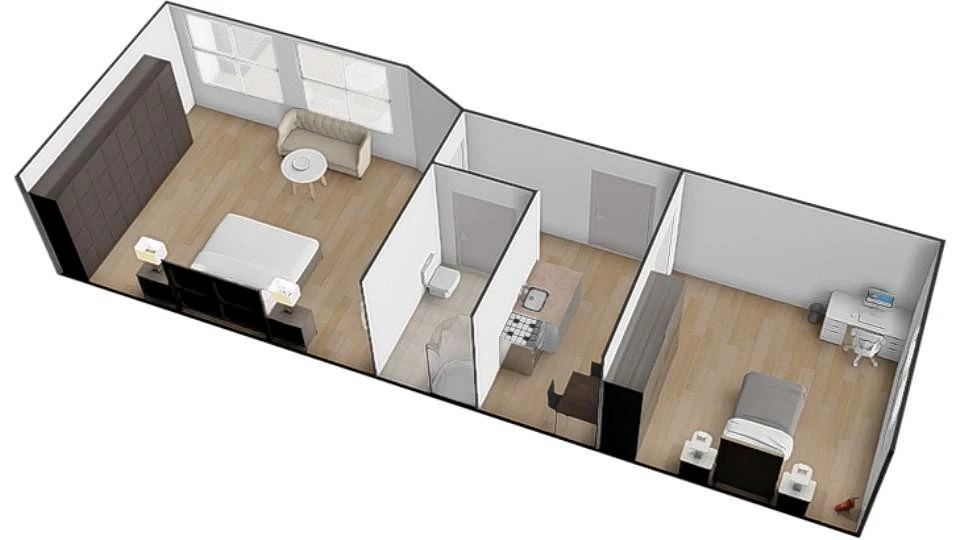 Po vstupu do bytu se nacházíme v místnosti, která slouží jako vstupní místnost a zároveň jako kuchyně. Celková výměra této místnosti je cca 7,44 m². Z kuchyně se můžeme dostat do prvního pokoje místnosti, který má celkovou výměru cca 14,57 m², a může dokonale posloužit jako obývací pokoj či jako ložnice. Dále je z kuchyně přístup do chodby, z které je přístup do koupelny. Ta je prakticky řešena, vybavena sprchovým koutem, toaletou a umyvadlem. Celková plocha koupelny je cca 2,82 m². Následuje poslední místnost o celkové ploše cca 17,16 m². Tento pokoj je orientován do klidného vnitrobloku což zajištuje komfort a soukromí.