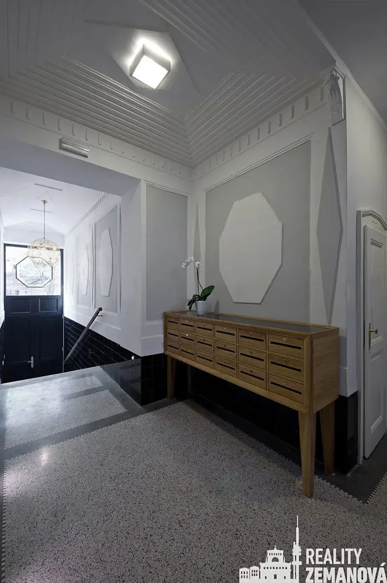 Dispoziční řešení: prostorná vstupní hala se samostatnými vstupy do dvou stejně velkých místností – jedna orientovaná do klidného vnitrobloku, druhá do ulice. Dále koupelna se sprchovým koutem a WC a samostatná malá uzavíratelná kuchyňka vybavená lednicí a myčkou.