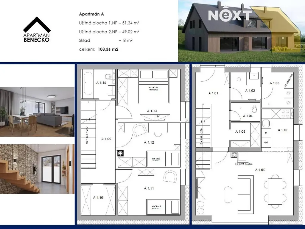 Zděný objekt s moderním dřevěným fasádním obkladem a sedlovou střechou. Interiér je řešený ve vysokém standardu odpovídající trendům moderního bydlení a trávení volného času. Vlastní pozemek odpovídající velikosti s parkovacím stáním na dvě vozidla pro každý apartmán. Vytápění pomocí tepelného čerpadla a krbu. Elektrický ohřev teplé vody v každé jednotce, společná čistička odpadních vod, obecní vodovod a elektřina přivedena na pozemek. Přístup po celoročně udržované obecní komunikaci.