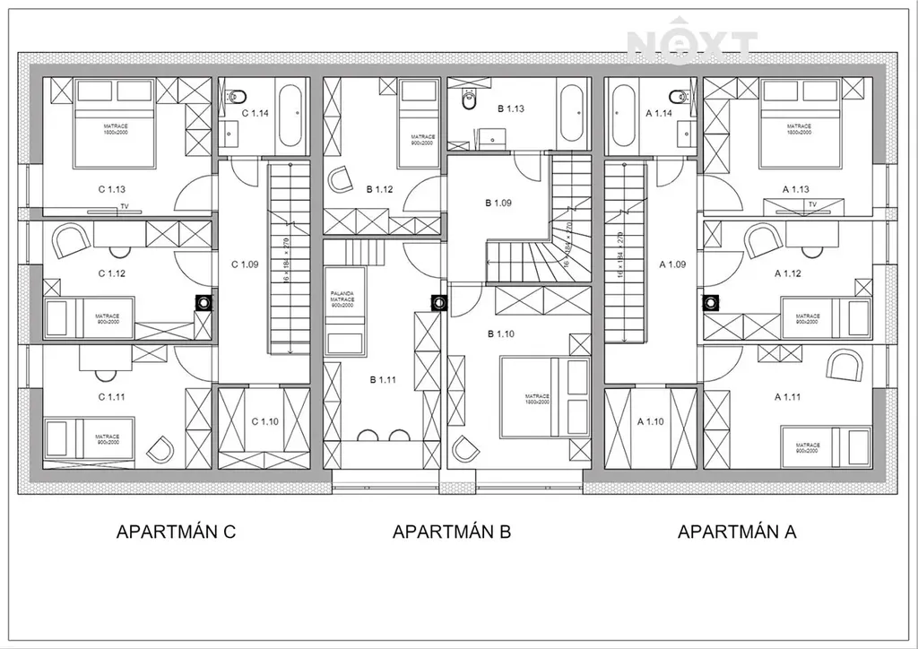 Projekt apartmánového domu obsahuje tři samostatné bytové jednotky s vlastním vchodem, skladem na sportovní náčiní, vlastním přímým vstupem na terasu a do zahrady. Každý apartmán je rozložen do dvou pater a má celkovou rozlohu cca 108 m2.
