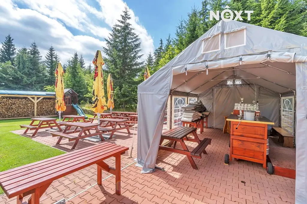 Vlastní osvětlené parkoviště. Možno přístavby navazující na byt správce. Další možnost stavby na místě stávající dílny. Na zahradě venkovní posezení, dětské hřiště, ohniště, bazén a několik vybavených party stanů na pořádání venkovních oslav.¨