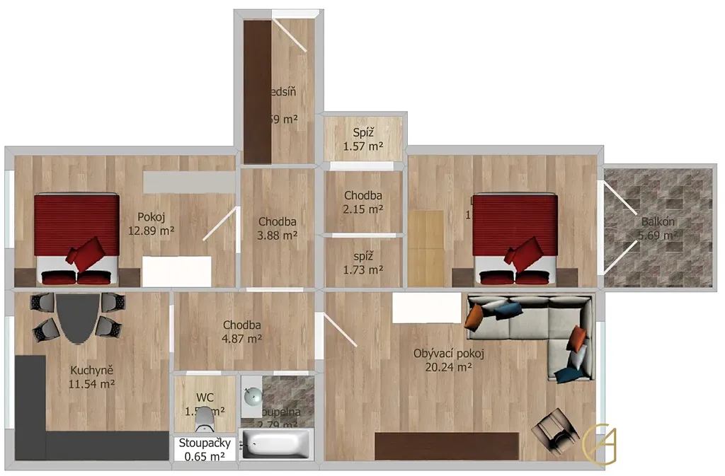 Byt má výbornou dispozici 3+1, oddělenou kuchyni, prostorné pokoje a okna na východ i západ, takže je celý den krásně světlý. Součástí je také balkon 5,6 m², ideální na ranní kávu nebo chvíli klidu.