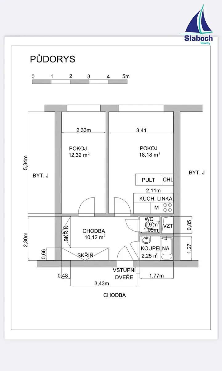Bytová jednotka je situována ve zvýšeném přízemí (2 metry od spodní hrany okna) velmi pěkného panelového domu po rekonstrukci. Byt disponuje obývacím pokojem s kuchyňským koutem včetně kuchyňské linky se spotřebiči, dostatečně prostornou ložnicí, koupelnou s vanou a přípojkou na pračku, samostatnou toaletou a prostornou předsíní s vestavěnou skříní na míru. Pokoje jsou neprůchozí.