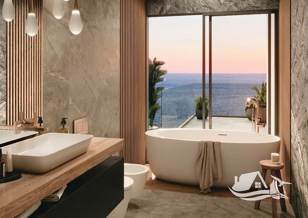 Celková plocha 139 m² nabízí prostorný obývací pokoj s kuchyňským koutem a panoramatickými okny, tři samostatné ložnice a tři luxusní koupelny. Hlavní koupelna poskytuje unikátní zážitek díky velkému francouzskému oknu s přímým výhledem na moře, který vytváří atmosféru soukromého spa. Dispozice je navržena s důrazem na komfort, funkčnost a maximální soukromí pro každého člena domácnosti i hosty.