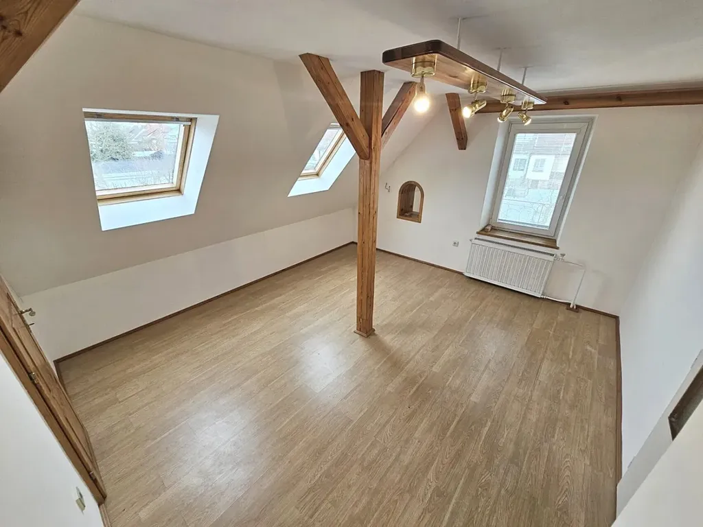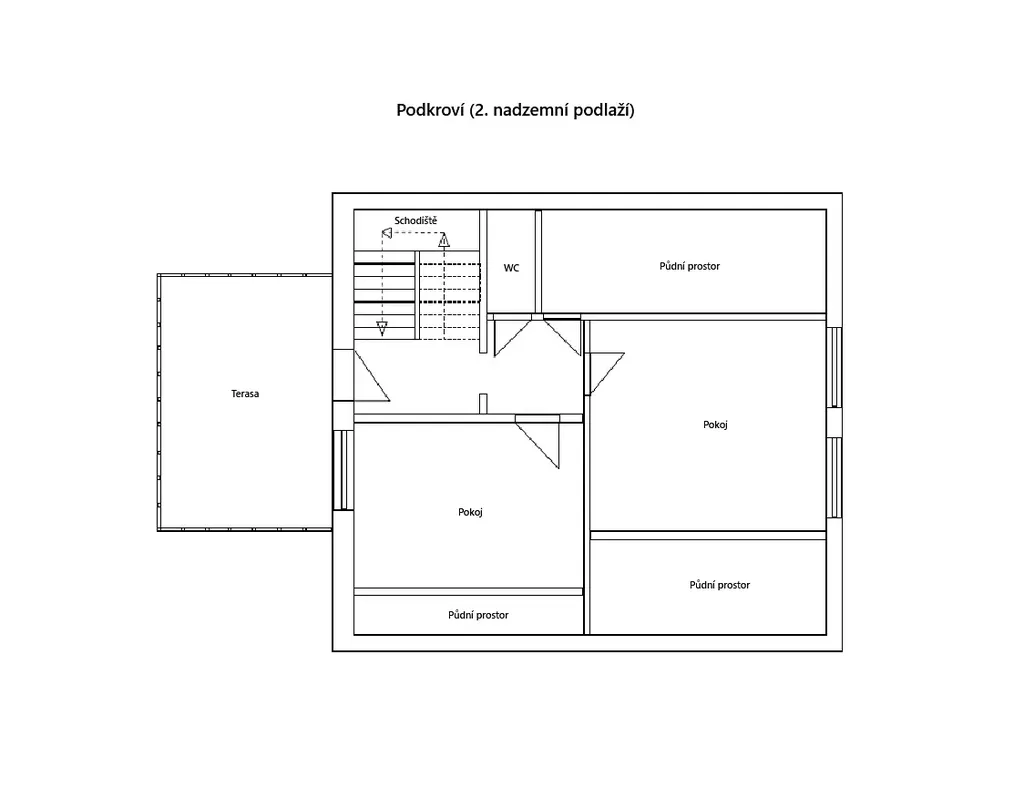 Podkroví - dva pokoje (16,2 a 15 m2), chodba, WC, schodiště, půdní prostory, terasa (17,2 m2)