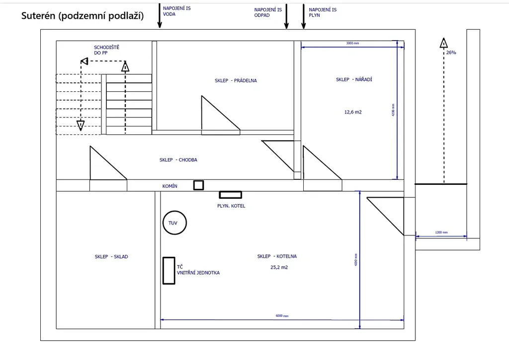 Suterén - celkem 68 m2, technická místnost, sklad, spíž, prádelna.
