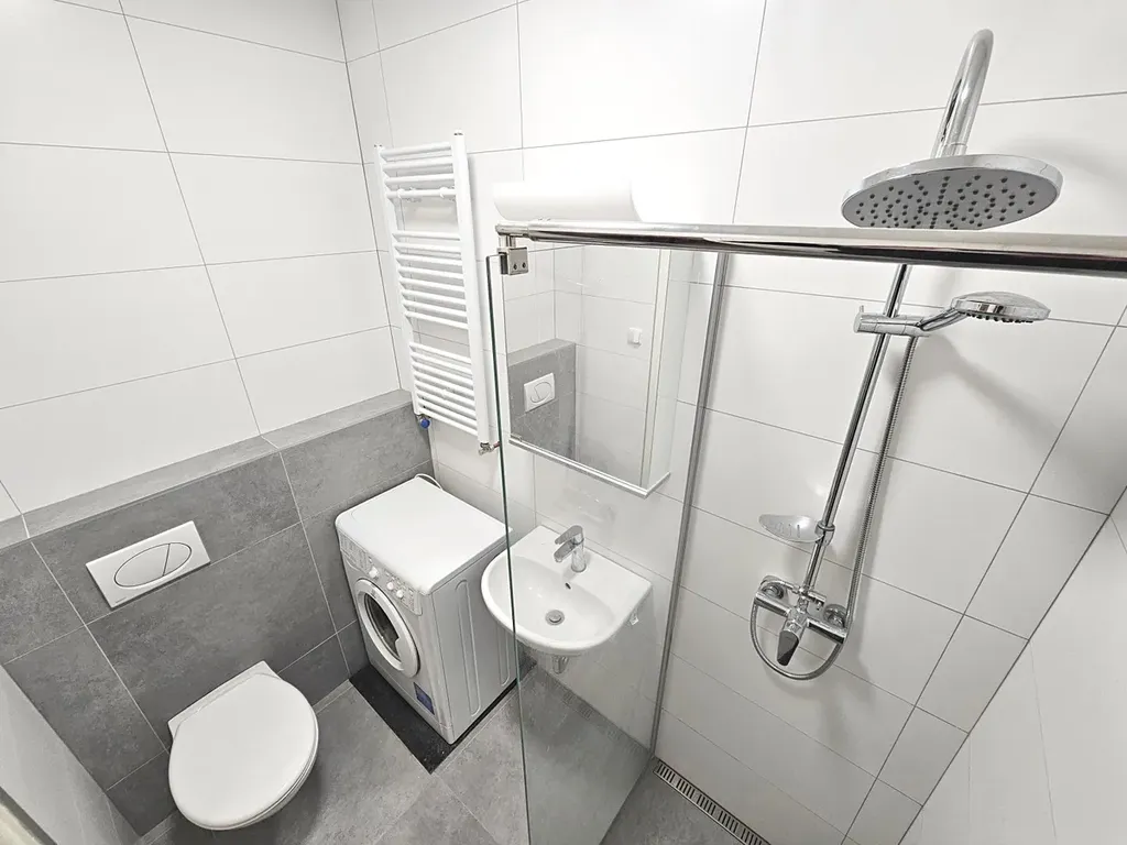 V bytě se nachází pokoj s kuchyňskou linkou (21 m2, sklokeramická varná deska, digestoř, lednice) + koupelna se sprchovým koutem a s WC (pračka) + předsíň.