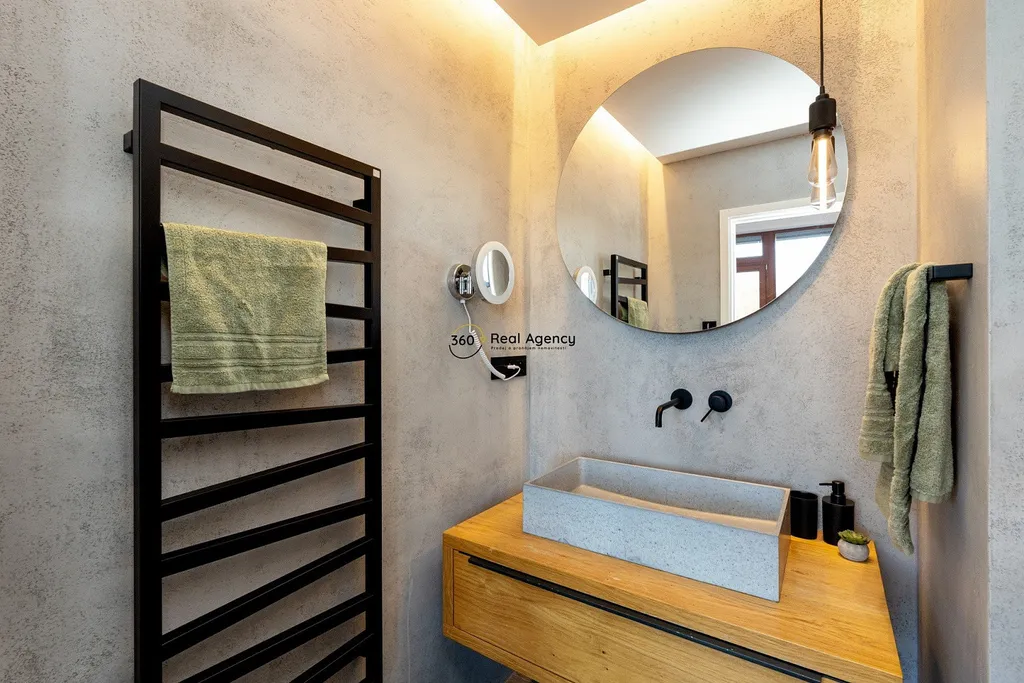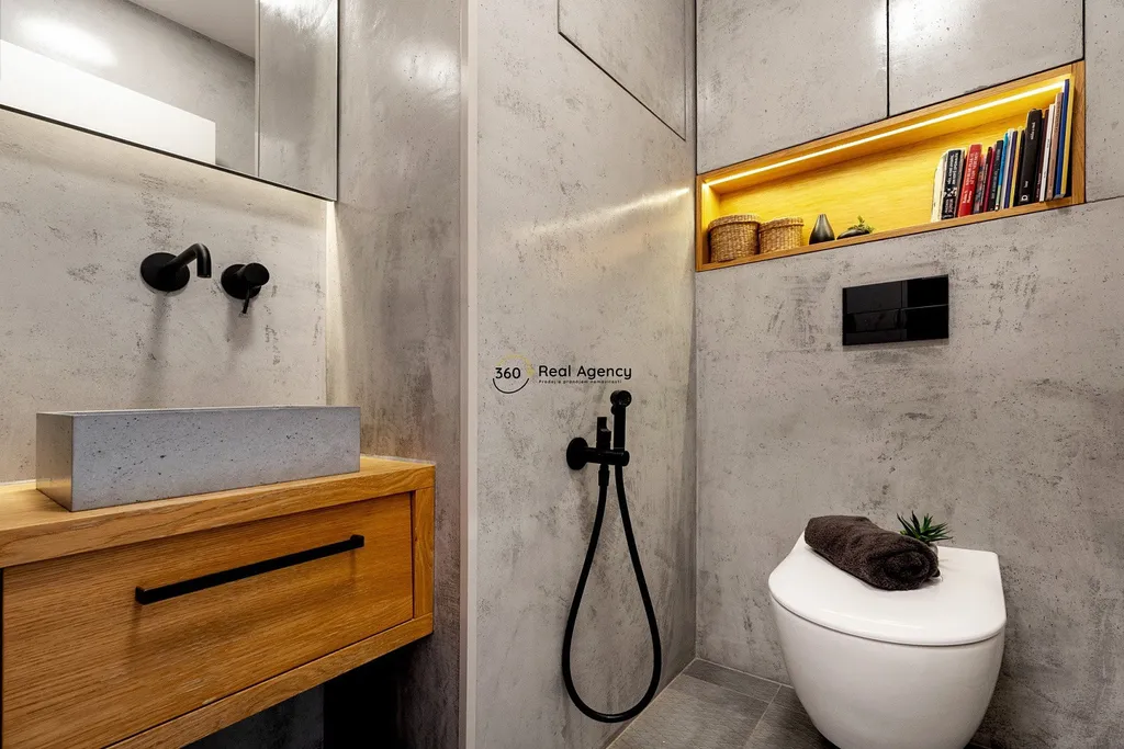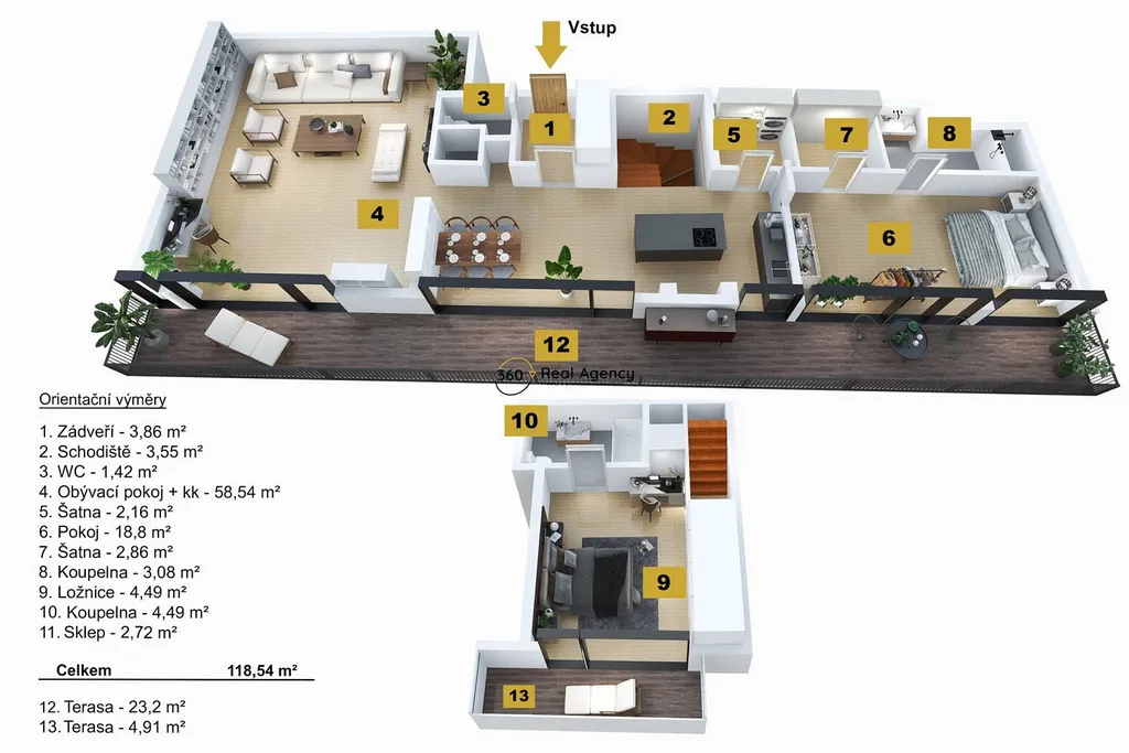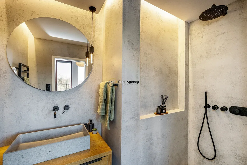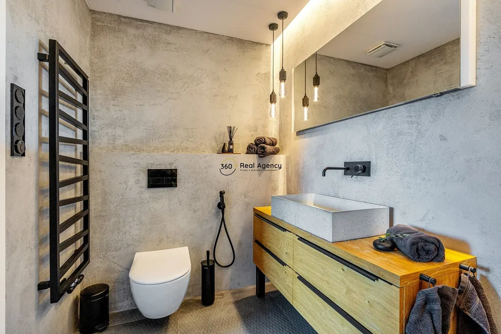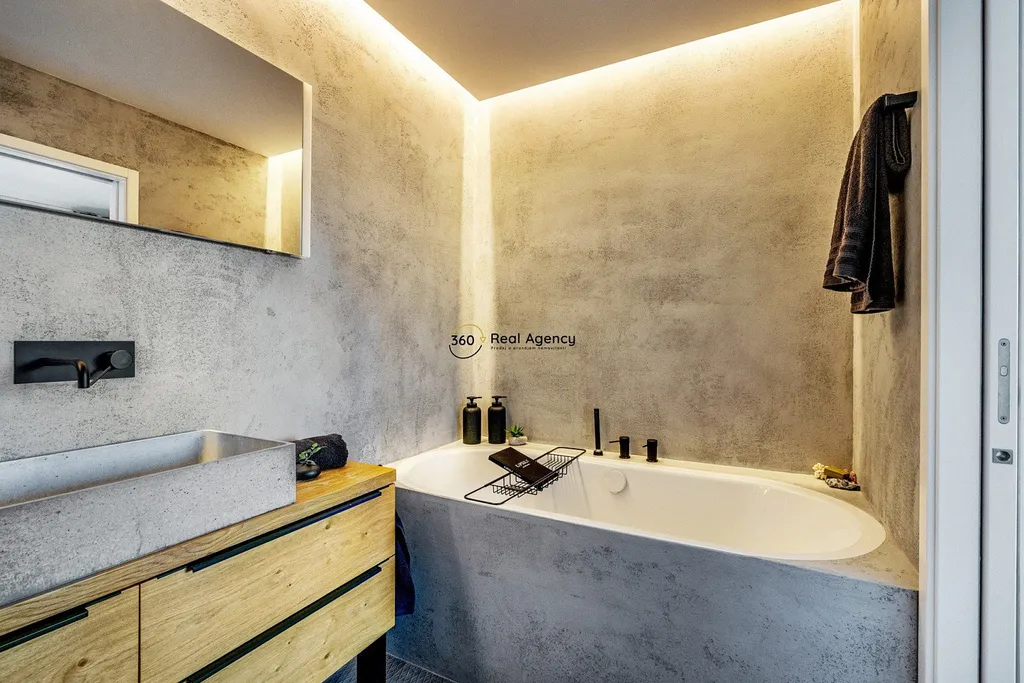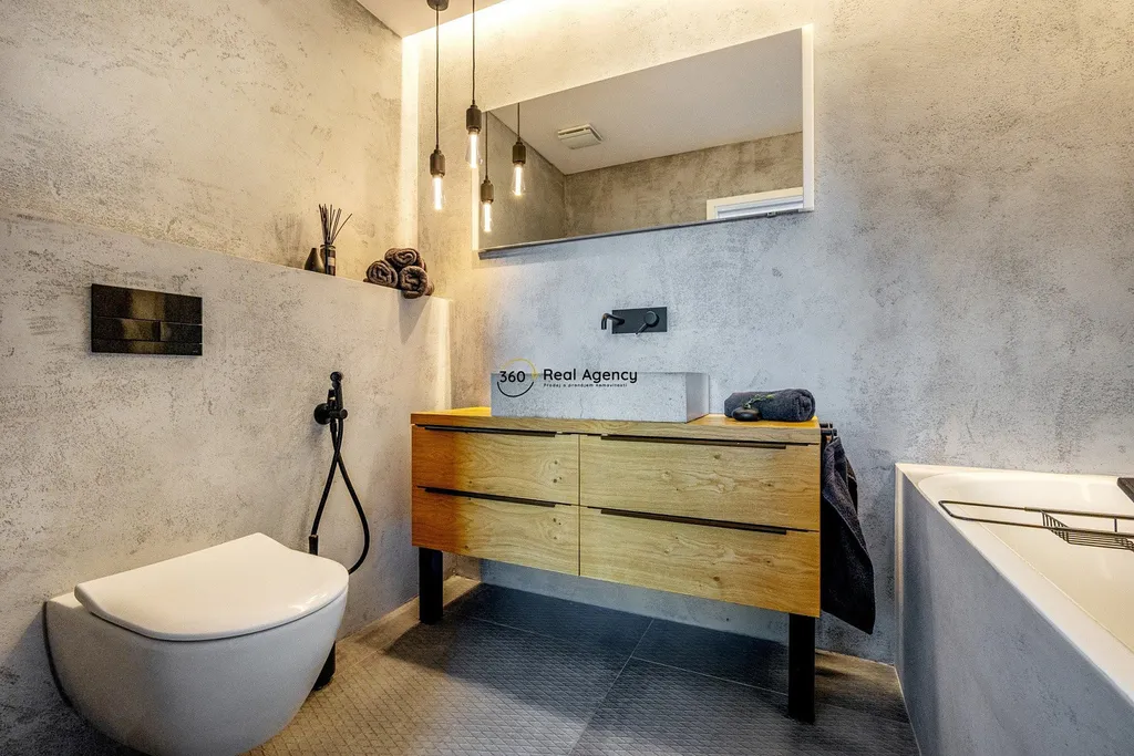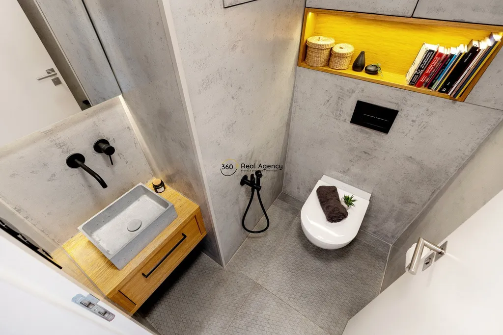 Spodní patro nabízí další plnohodnotnou ložnici s vlastní koupelnou a toaletou. Součástí této úrovně je také samostatná terasa, která dává spodní ložnici vlastní venkovní prostor a vysokou míru flexibility – ideální řešení pro děti, hosty nebo kombinaci bydlení a práce.