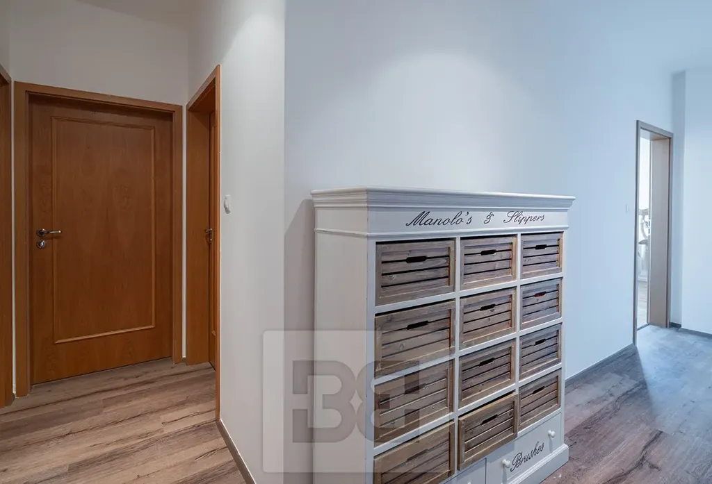 Ložnice je částečně zařízená – postel, pracovní stůl a knihovna. Druhá, menší ložnice je vybavena šatní skříní. Další velkou výhodou je samostatná šatna přímo v bytě.